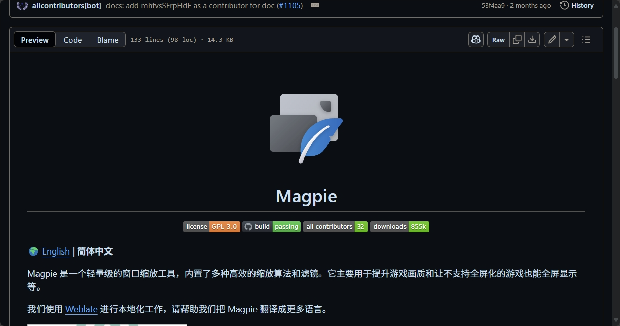 我感觉在互联网应当会有与Lossless Scaling提供相似功能的软件,在互联网上冲了一会浪之后,我找到了本文的主角:Blinue/Magpie: An all-purpose window upscaler for Windows 10/11.。根据其在Github的介绍,Magpie 是一个轻量级的窗口缩放工具,内置了多种高效的缩放算法和滤镜。它主要用于提升游戏画质和让不支持全屏化的游戏也能全屏显示等。