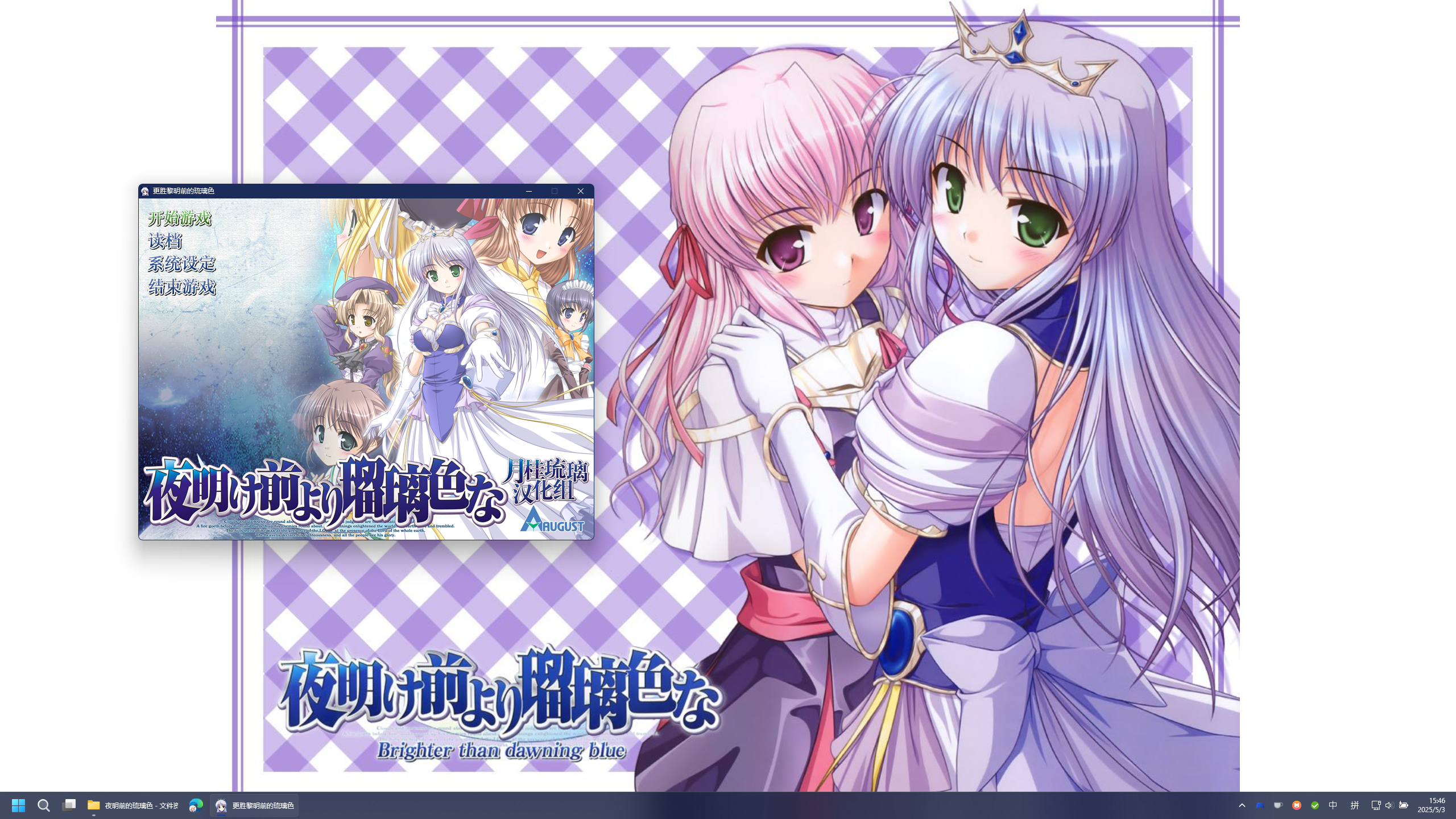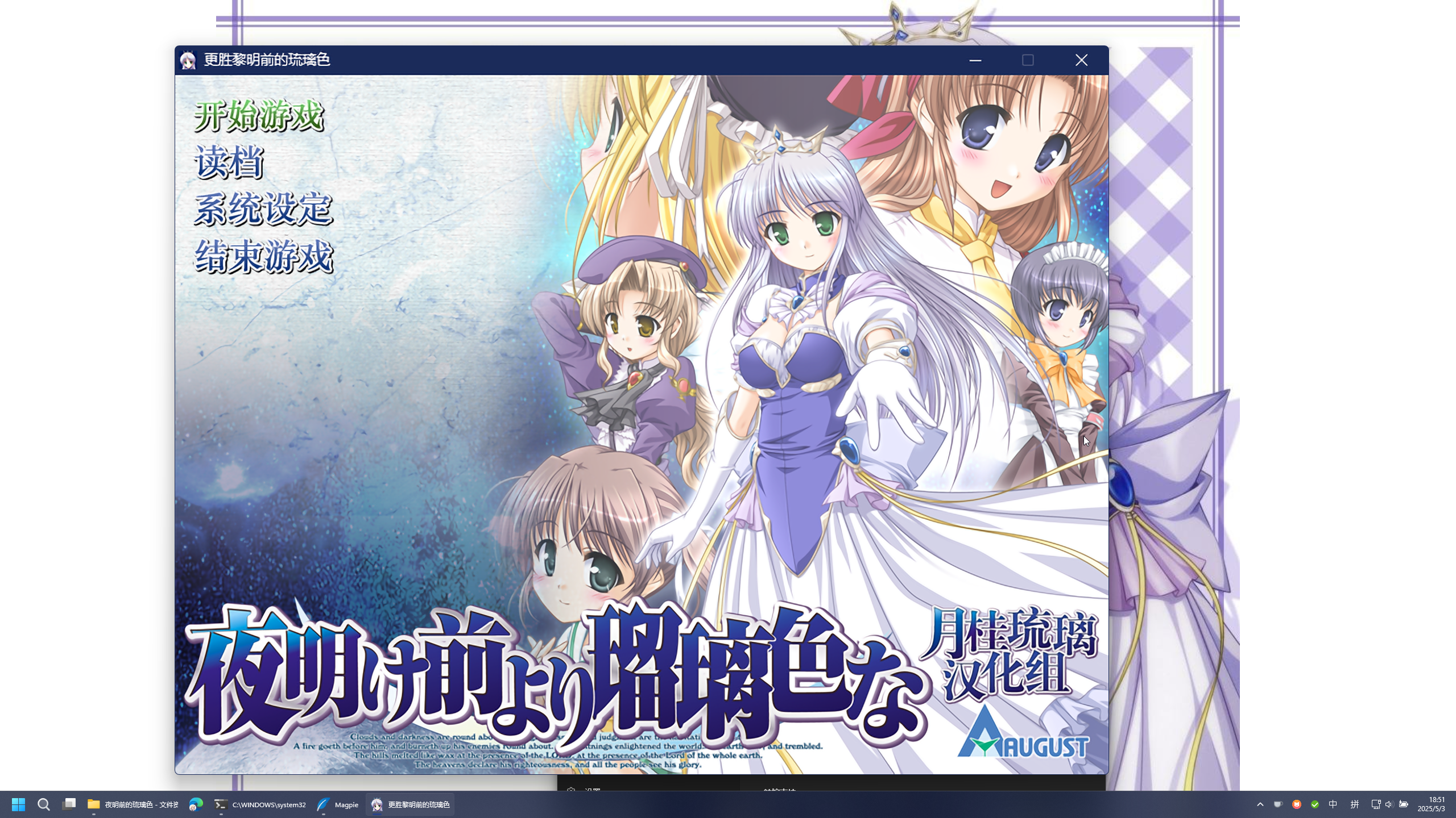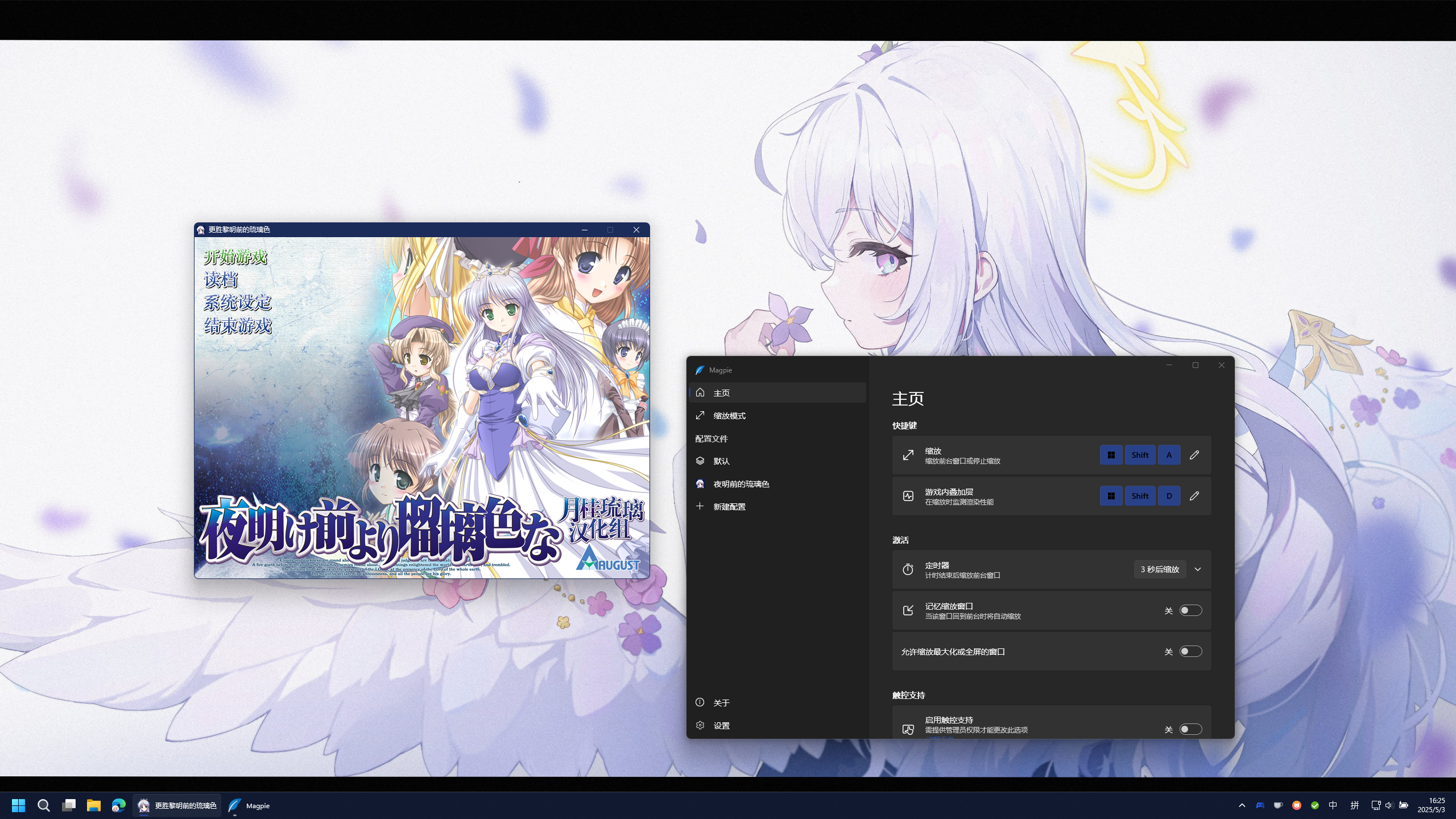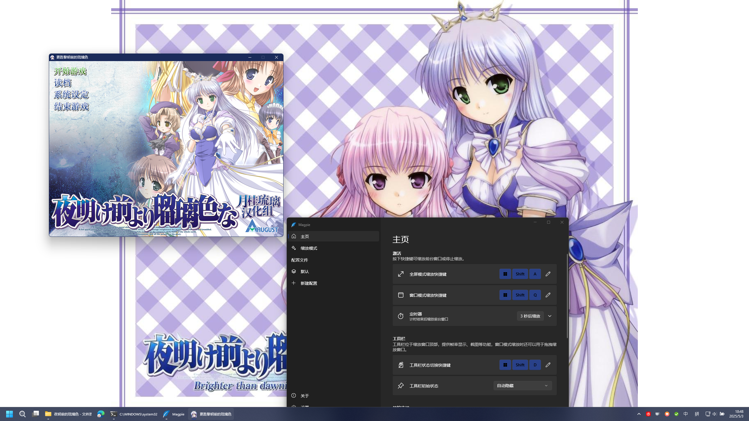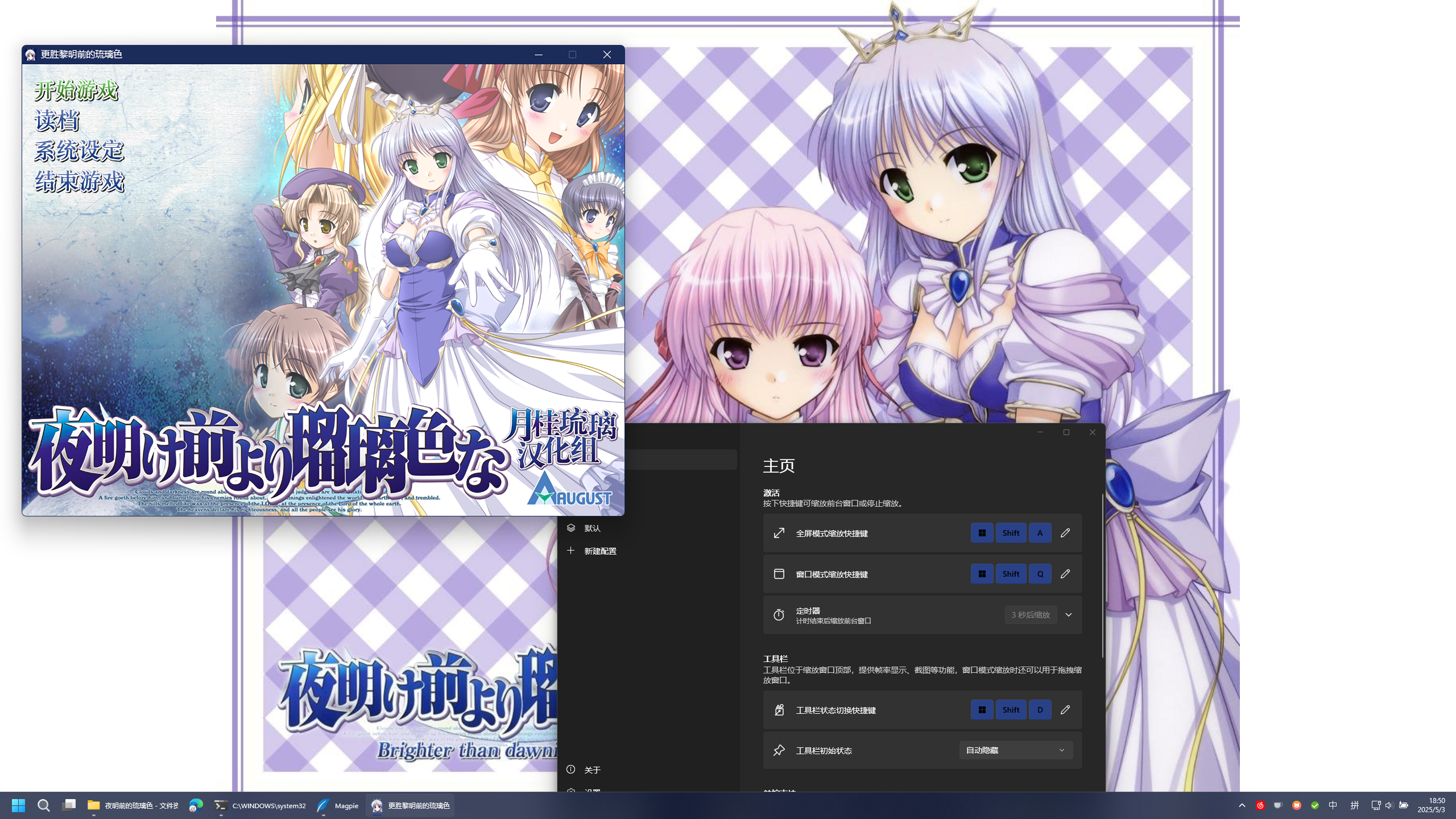 五一打算推一款很老的Galgame ——《黎明前的琉璃色》,然后发现这部galgame在窗口化模式下在2k显示器下显得太小了,而我又不想开全屏模式(况且直接全屏能够明显感到分辨率不足的马赛克)。而我以前使用过Lossless Scaling给《Minecraft》进行超分和插帧(关于这部分的内容可以见著名minecraft区UP主籽岷的视频:玩MC帧数不够?小黄鸭(AI插帧)来补!LSFG 3.0 )。然而在Lossless Scaling遇到了相当多的问题,不想开全屏模式的核心诉求也没有完全解决,最后一番周折使用了Mapgie的开发中的“窗口模式缩放”功能,实现了给Galgame窗口模式提高分辨率的功能。