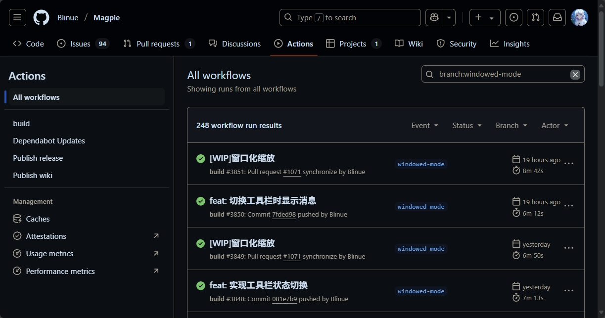 尽管 Mapgie 提供了超分算法,但是在缩放后依旧会将窗口变为全屏,这并没有完成我最初想要实现了放大窗口的需求,而后我在 Mapgie 的 issue 栏目中看到了有网友已经向开发者提出了类似的功能请求:窗口化缩放 Windowed Mode · Issue #135 · Blinue/Magpie。而开发者在最新的动态中表示正在将这个功能作为开发中,并且已经做出了若干开发中版本(关于这个功能的开发状态可以参见[WIP]窗口化缩放 by Blinue · Pull Request #1071 · Blinue/Magpie)。因此我们可以在项目中找到最新的开发中版本下载(开发中版本编译好的文件可以在Github Action中找到)